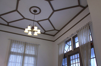屋根の正面に見える「ドーマ(屋根窓)」や 柱の骨組みを壁に埋め込まずに装飾模様として活かすハーフ・チェインバー 方式が特徴です。